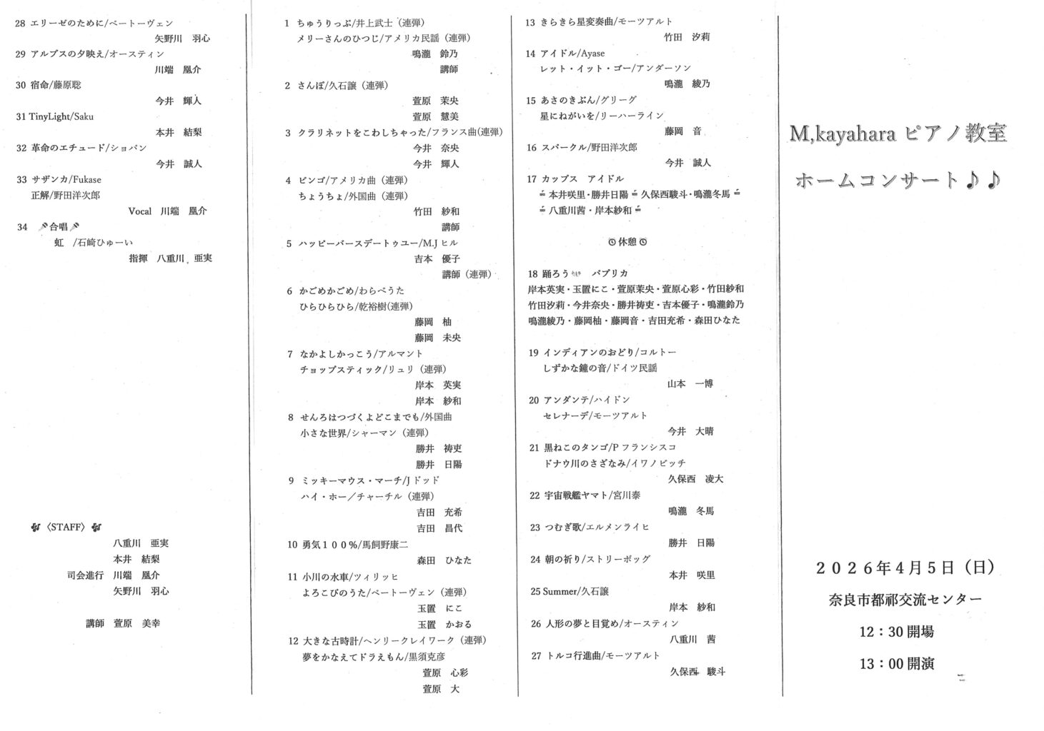 4月5日(日)都祁交流センターふれあいホール高原にてM,kayaharaピアノ教室ホームコンサートを開催します是非お越しください、全席無料です